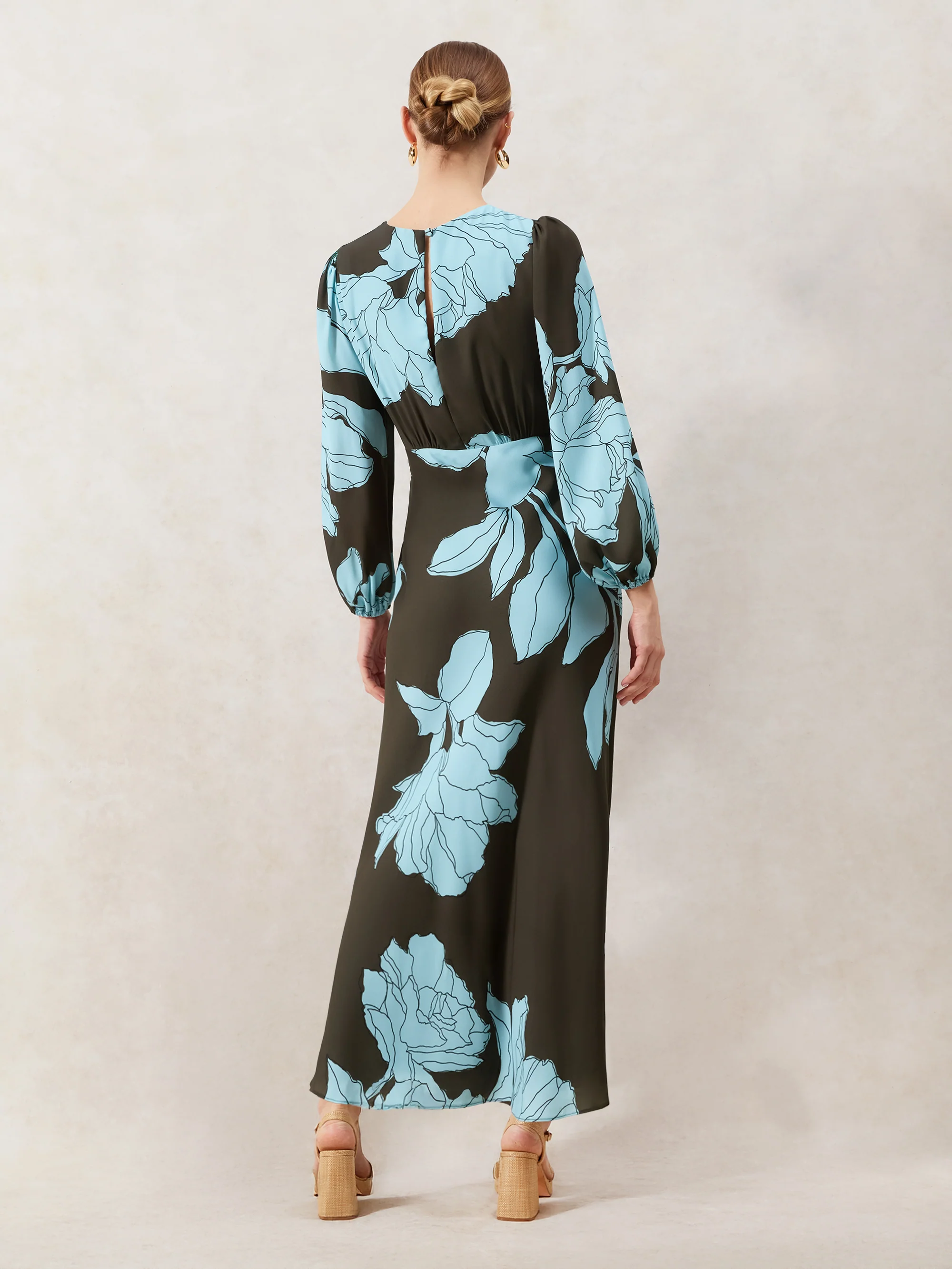 Contrast Ditsy-Print Puff-Sleeve Midi Dress