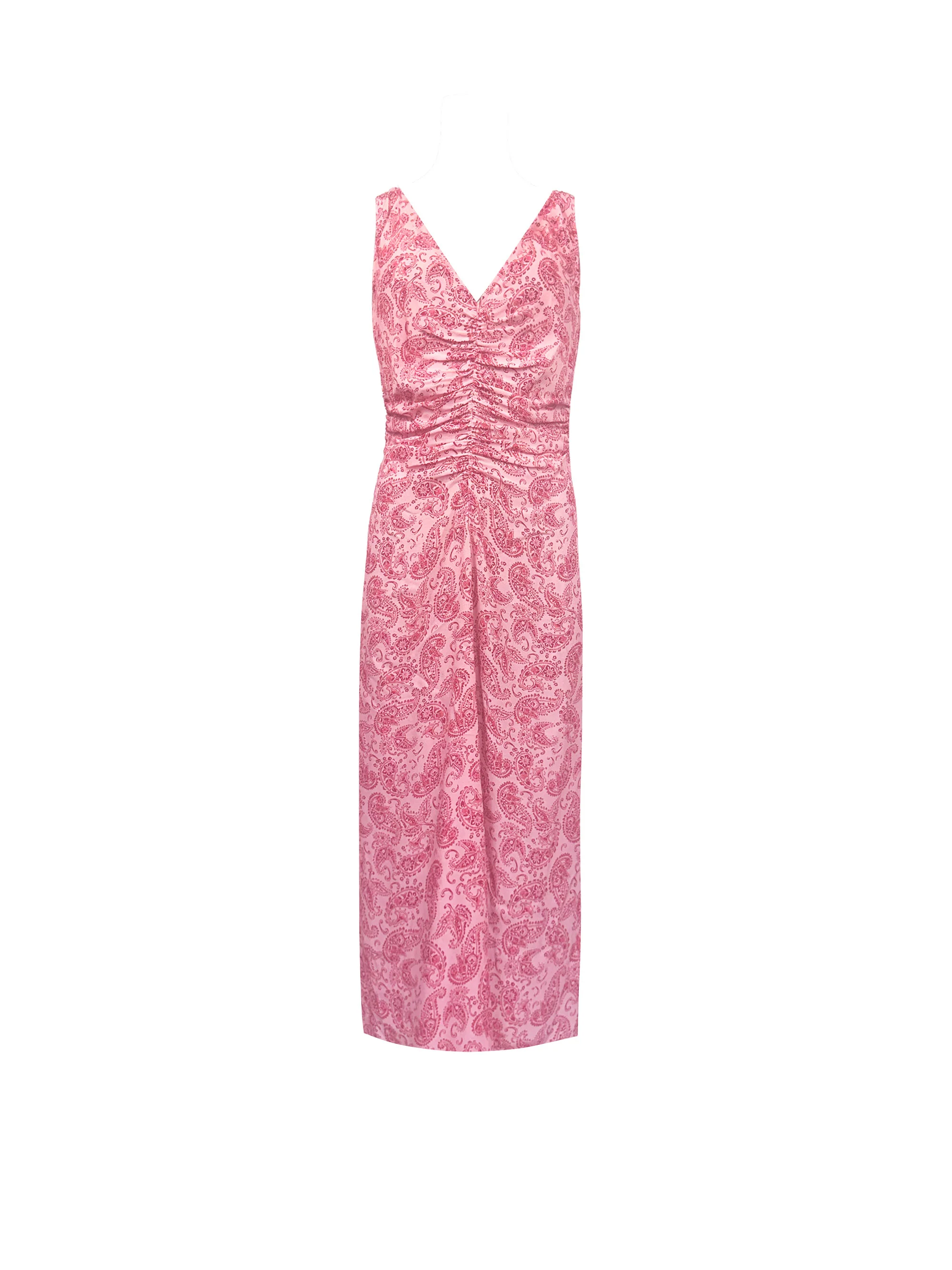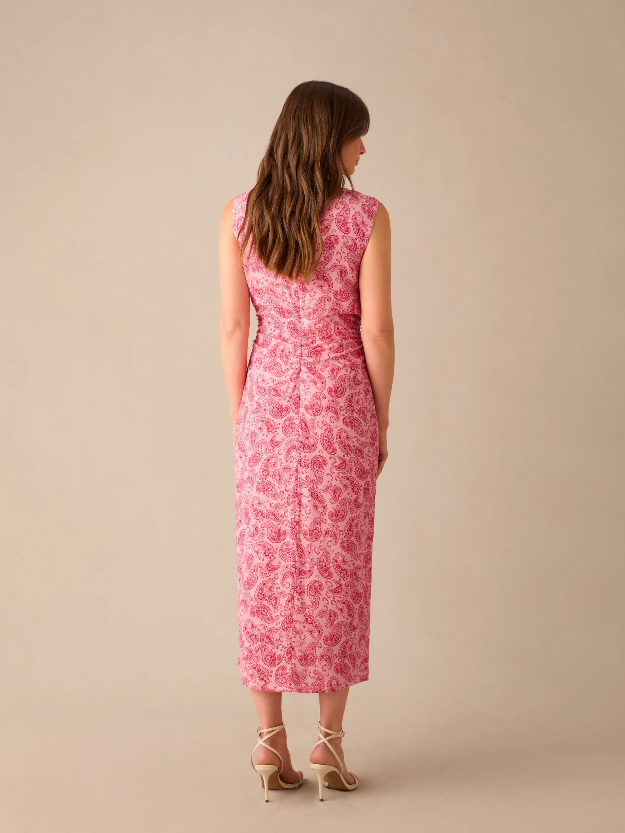 Petite Pink Paisley Ruched Front V-Neck Midi Dress